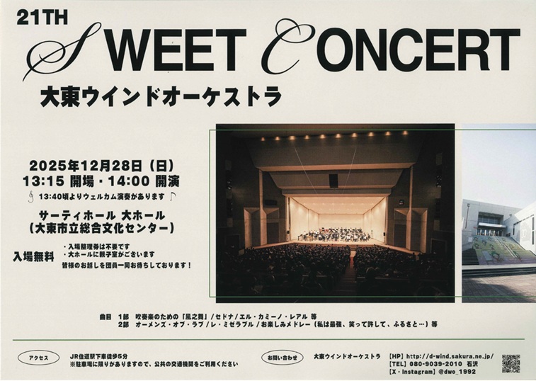 2025年12月28日(日)に開催される「第21回スウィートコンサート」(大東ウインドオーケストラ主催)に、弊社社員が出演いたします!