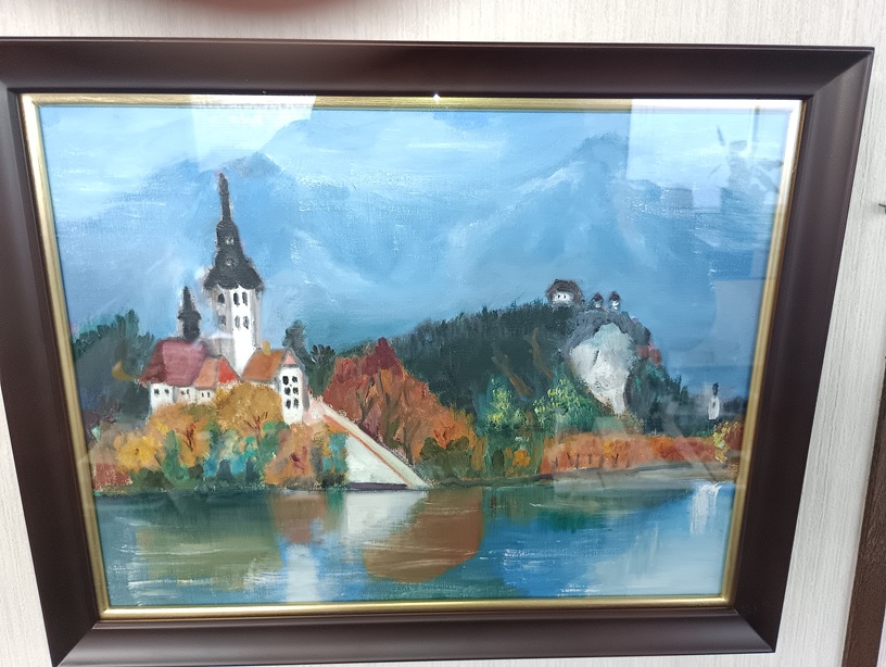 今回の作品は、湖畔に佇む教会と紅葉の木々が描かれた、秋の風景画。